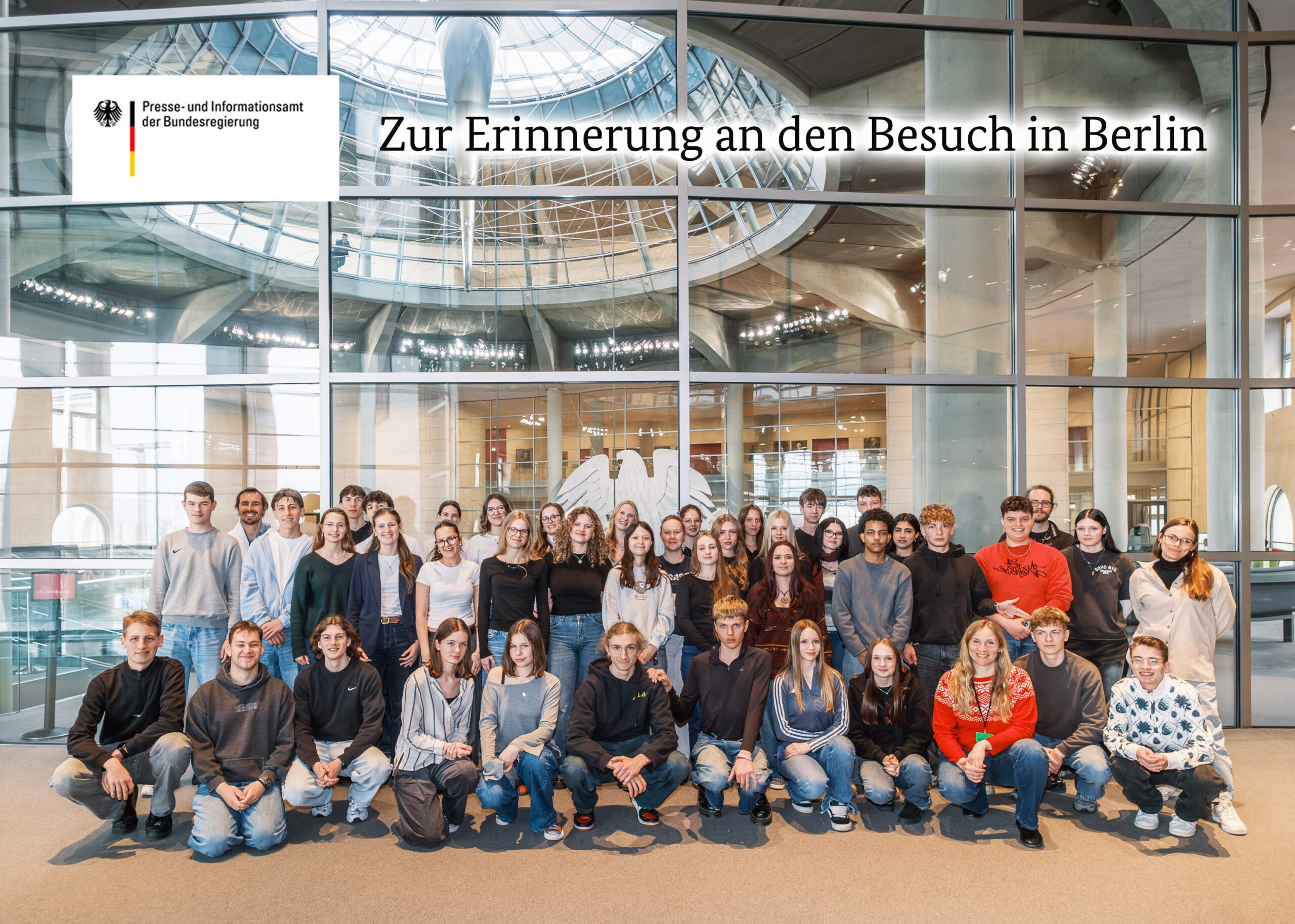Der Wandertag am 16.03.2026 wurde dieses Jahr genutzt, um mit den Klassen 10a1 und 10a2 sowie dem Sozialkunde-Grundkurs Klassenstufe 11 von Frau Schubert (inkl. ein paar weiteren interessierten Schülerinnen und Schüler der 11. Klasse) unsere Hauptstadt Berlin zu besuchen. Ziel des Ausflugs war ein Besuch im Bundestag mit anschließender Gesprächsrunde der Schüler und Lehrkräfte mit einem Bundestagsabgeordneten. Die restliche Zeit des Ausflugs beinhaltete einen Rundgang auf dem Dach des Reichstagsgebäudes, ein Mittagessen im Restaurant Viale dei Tigli, eine zweistündige Stadtrundfahrt durch Berlins Stadtmitte und zum Abschluss eine Stunde Freizeit am Potsdamer Platz.