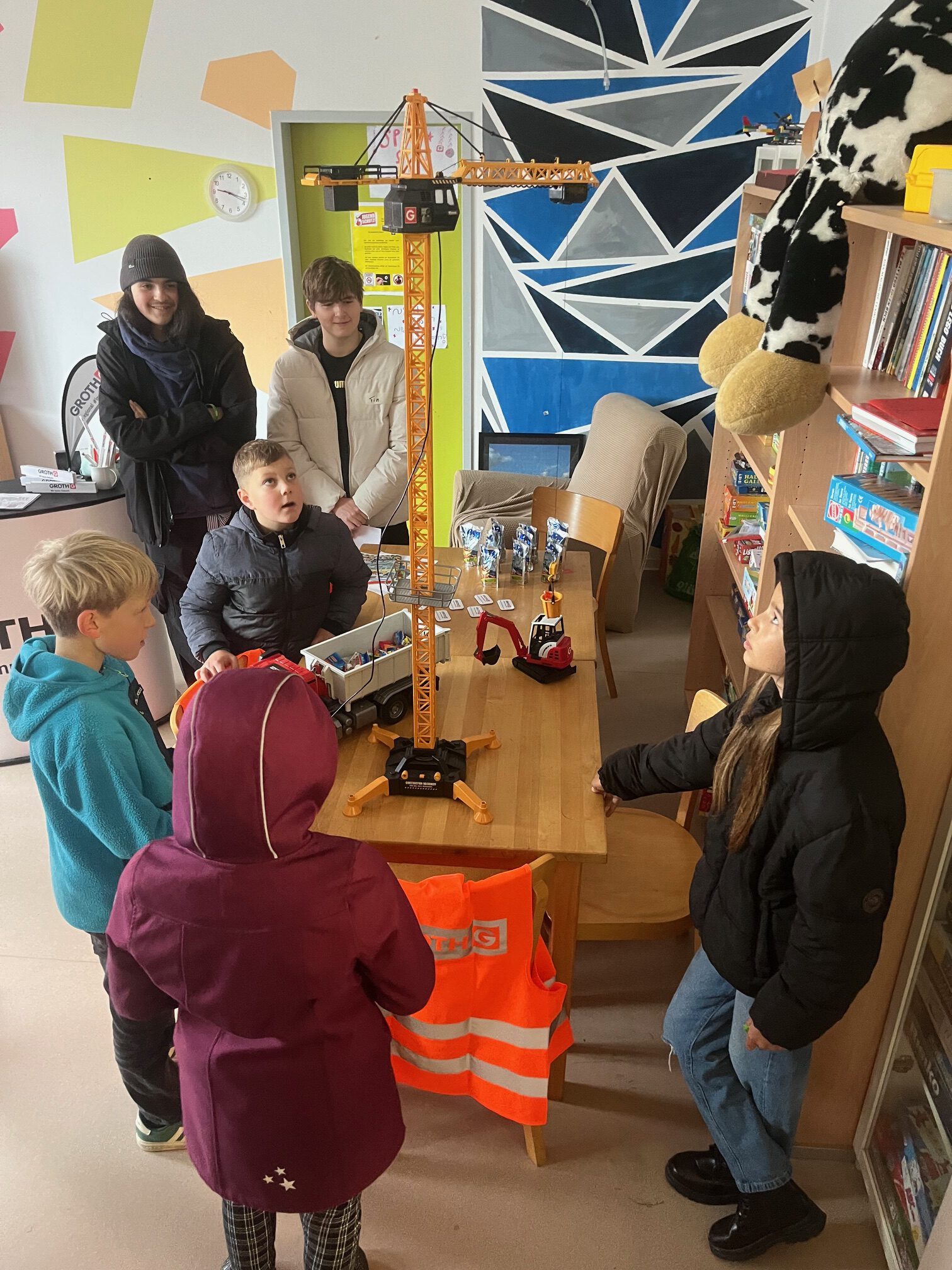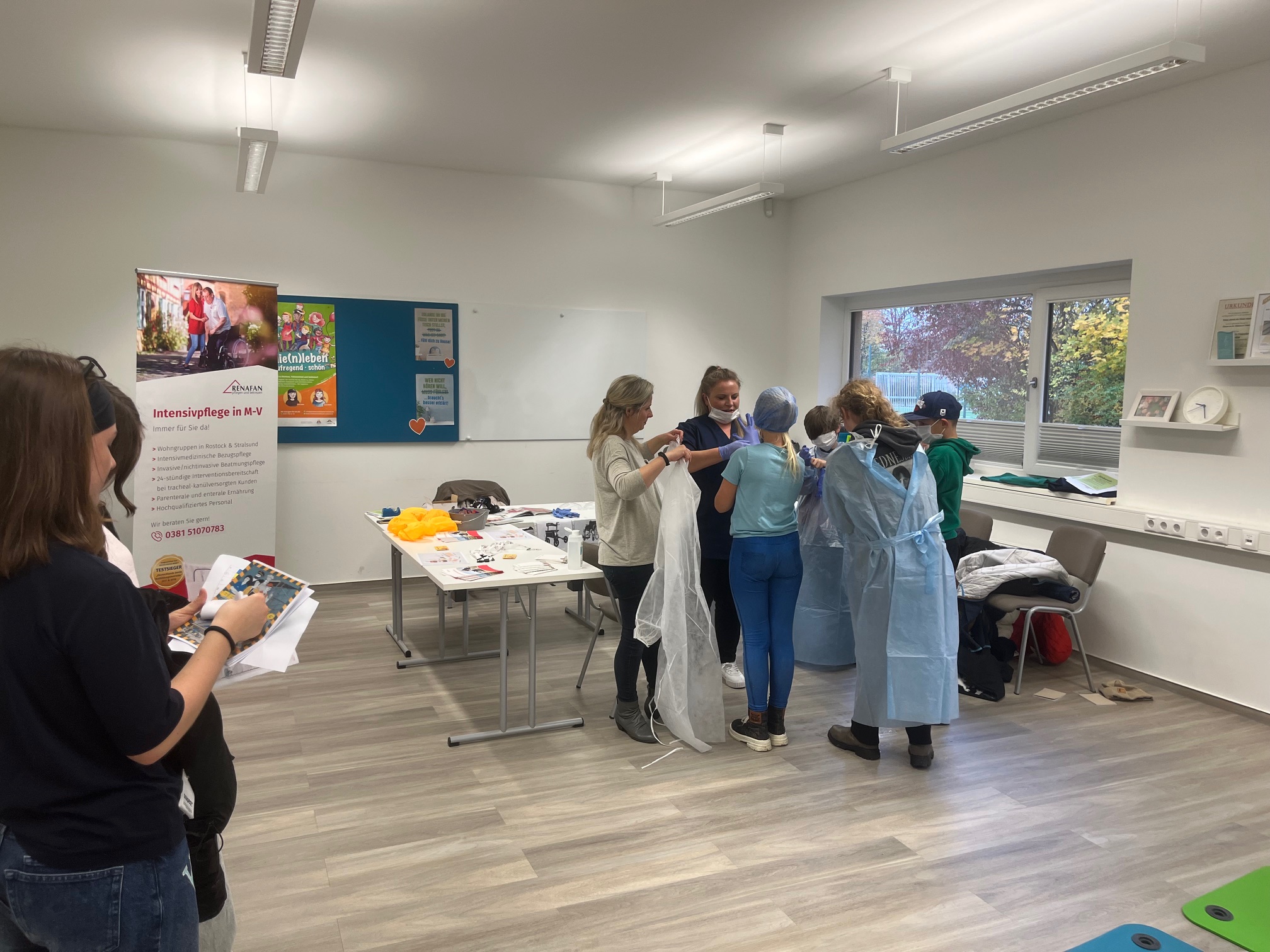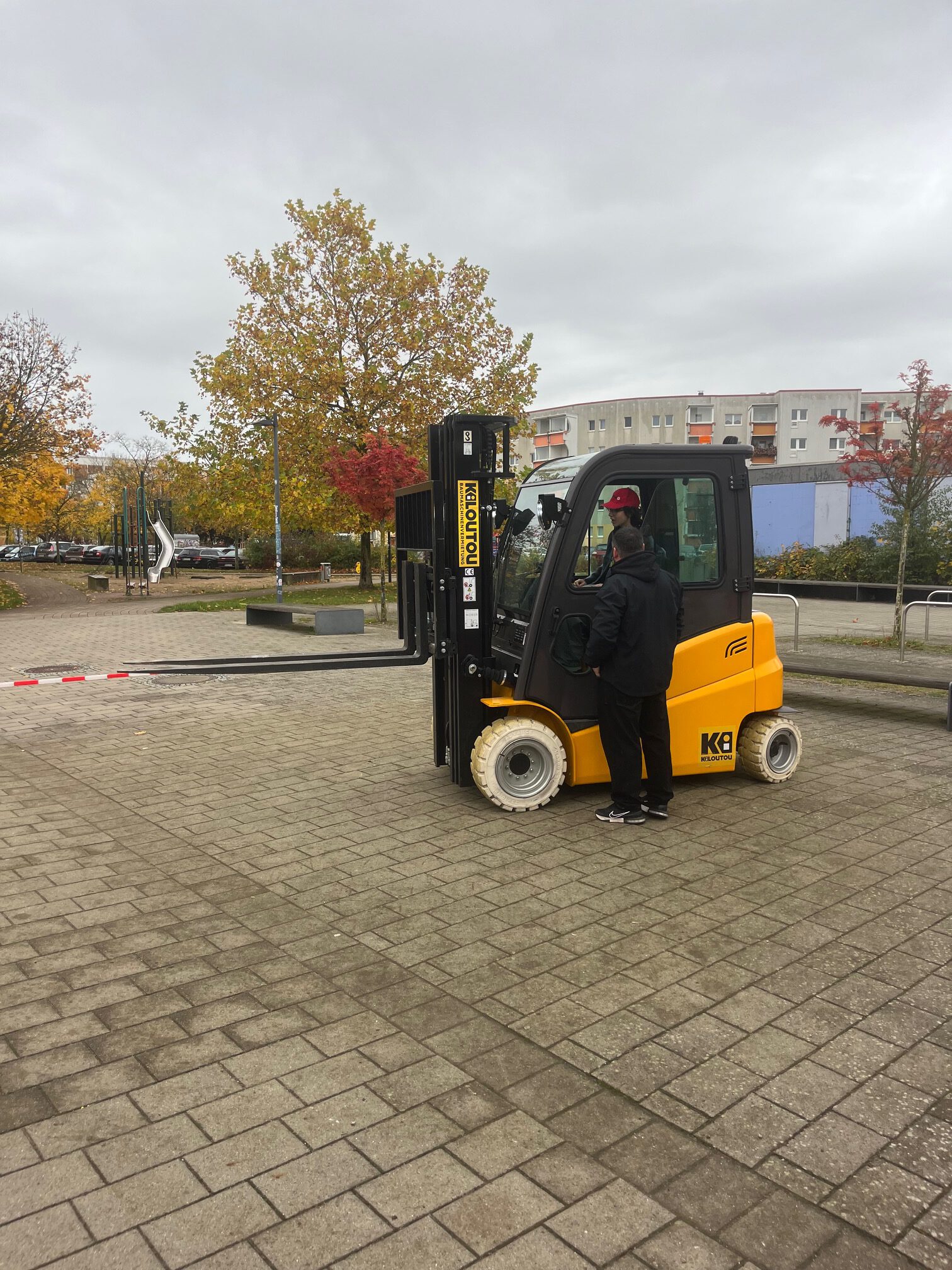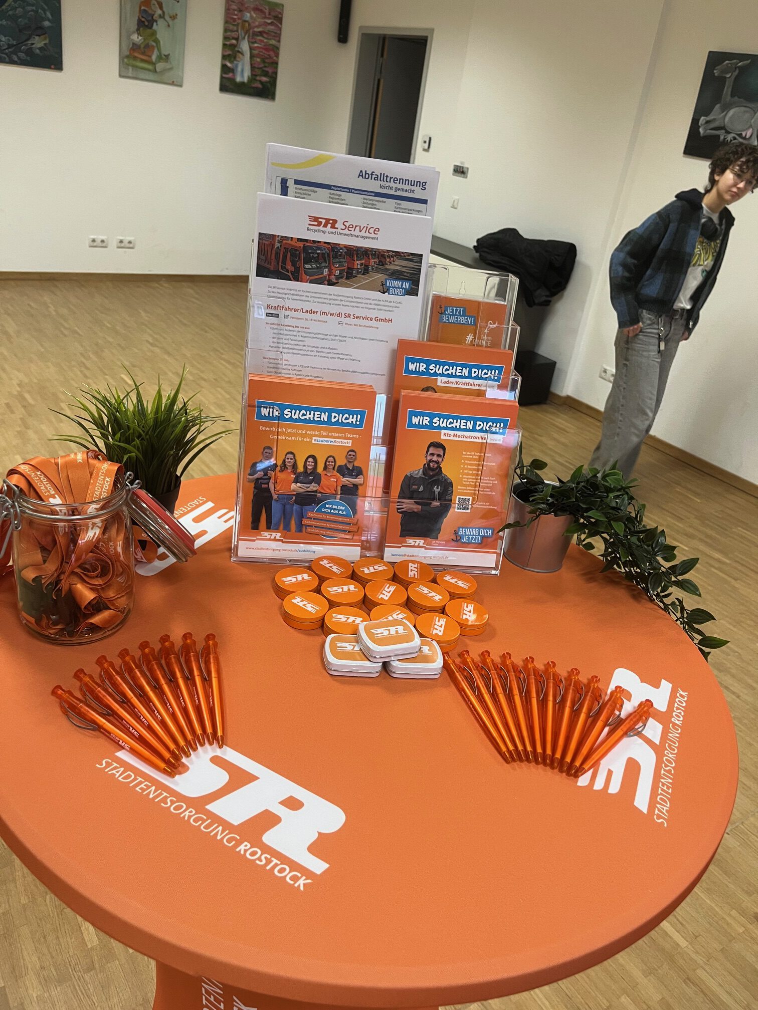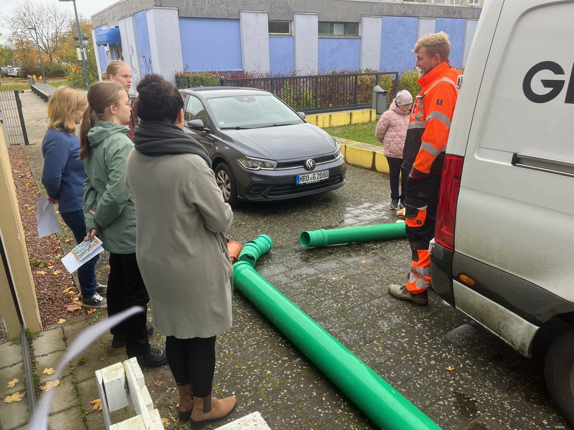Rostock, 28. Oktober 2025 – Einen Bagger aus nächster Nähe erleben, ein Stück Weg pflastern oder die Arbeit der Rostocker Stadtentsorgung kennenlernen: Der Berufe-Tag im Stadtteil- und Begegnungszentrum (SBZ) Dierkow machte es möglich. Am Dienstag bot das Pilotprojekt Schülerinnen und Schüler der 10m1 die Chance, Berufe hautnah zu entdecken und Firmen aus der Region kennenzulernen, die Praktikumsplätze und Ausbildungen anbieten. „Anfassen, ausprobieren, mitmachen, fragen“ – unter diesem Motto standen die praxisnahen Begegnungen mit zehn Unternehmen, die sich auf dem Gelände des SBZ präsentierten. In kleinen Gruppen „wanderten“ die Schüler*innen vormittags von Station zu Station, um konkrete Tätigkeiten hinter Berufsbezeichnungen zu erleben. Arbeitszettel halfen, die Eindrücke festzuhalten. Am Nachmittag waren auch Eltern eingeladen, gemeinsam mit ihren Kindern die Angebote zu erkunden. „Viele junge Menschen tun sich schwer, sich Berufe vorzustellen. Wir wollen das ändern“, erklärt Dina Blank, Organisatorin vom SBZ Dierkow. Das Konzept kam an: Die Mischung aus praktischen