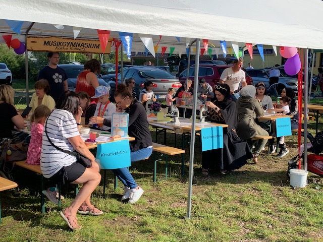 Das traditionelle Mühlenfest fand wie gewohnt am ersten Septemberwochenende statt. Bei herrlichem Wetter präsentierte sich das Musikgymnasiums Käthe Kollwitz mit vielen verschiedenen Stationen. Unsere Besucherinnen und Besucher konnten sich entweder künstlerisch kreativ austoben, Experimente aus der Physik erproben, den nordlichen Sternenhimmel erkunden, mit Mikroskopen anschauliche Präparaten erforschen, Tischtennis spielen, ihre Koordination bei kleinen Wurfspielen üben oder ihr Geschichtswissen auffrischen.