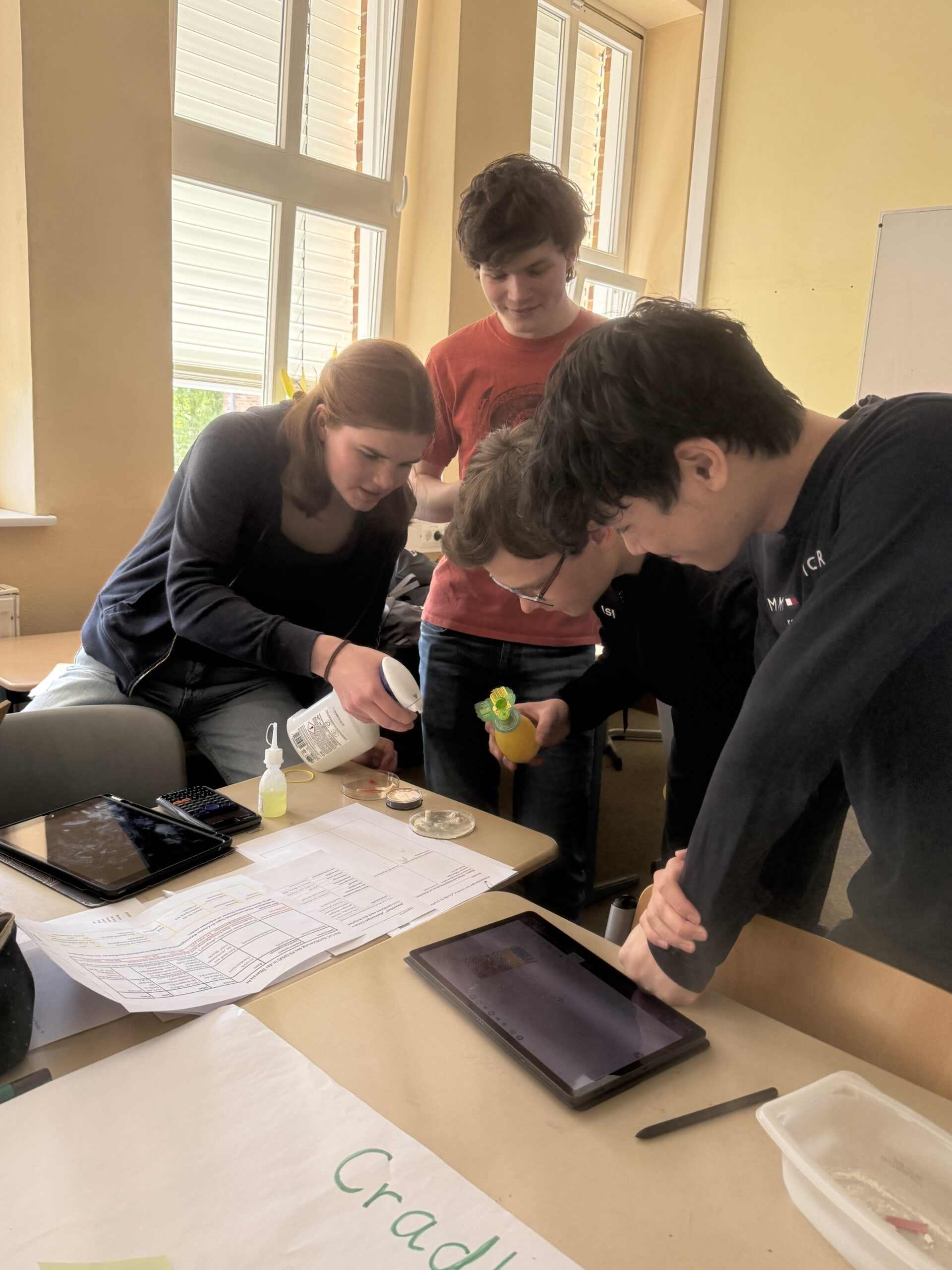 Die Schülerinnen und Schüler der Geographiekurse der Jahrgangsstufe 11 haben sich daher im Rahmen des Semesterthemas „Globale Herausforderungen und nachhaltige Raumentwicklung“ mit möglichen praktischen Ansätzen der Ressourcennutzung beschäftigt. Zu Beginn waren aber erst einmal die Tastsinne der Oberstufenschülerinnen und Oberstufenschüler gefragt, denn die zu erkundenden Produkte waren in einer interaktiven Holzbox versteckt. Bei den einen war es flauschig oder hart, bei anderen klein oder kantig. Unter anderem waren eine Trinkflasche, eine Bienenwachstüte und ein Teppichstück vor den neugierigen Blicken geschützt. Doch was haben diese Produkte mit Nachhaltigkeit nun zu tun? Dies sollten die Gruppen in einem selbst gesteuerten Gesprächs- und Erkundungsprozess herausfinden, indem jeder eine besondere Rolle u.a. als Impulsgeber, Lagerist oder Moderator einnahm.