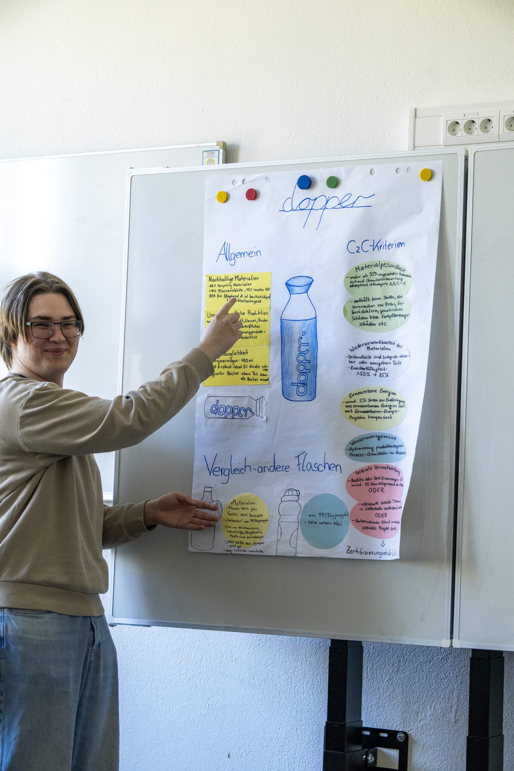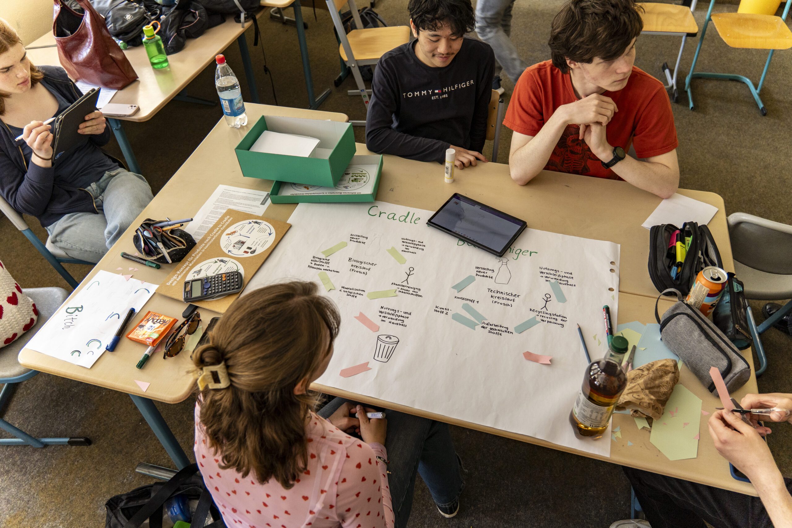 Was alle Produkte miteinander nun vereint, ist, dass sie auf dem „Cradle-to-Cradle“-Prinzip (Von der Wiege zur Wiege, kurz C2C) basieren, bei dem Produkte so produziert werden, dass alle Inhaltsstoffe bekannt und letztlich in einem biologischen oder technischen Kreislauf abgebaut/wiederverwertet werden. Unter der Anleitung von Workshop-Referentin Angelika Frank, ehemalige Wolfsburger Schulleiterin und Unternehmerin, präsentierten die einzelnen Gruppen abschließend ihre analysierten Produkte als einen möglichen Ansatz für nachhaltigen Konsum und nachhaltiges Wirtschaften in einer Welt, in der Rohstoffe immer knapper werden.
