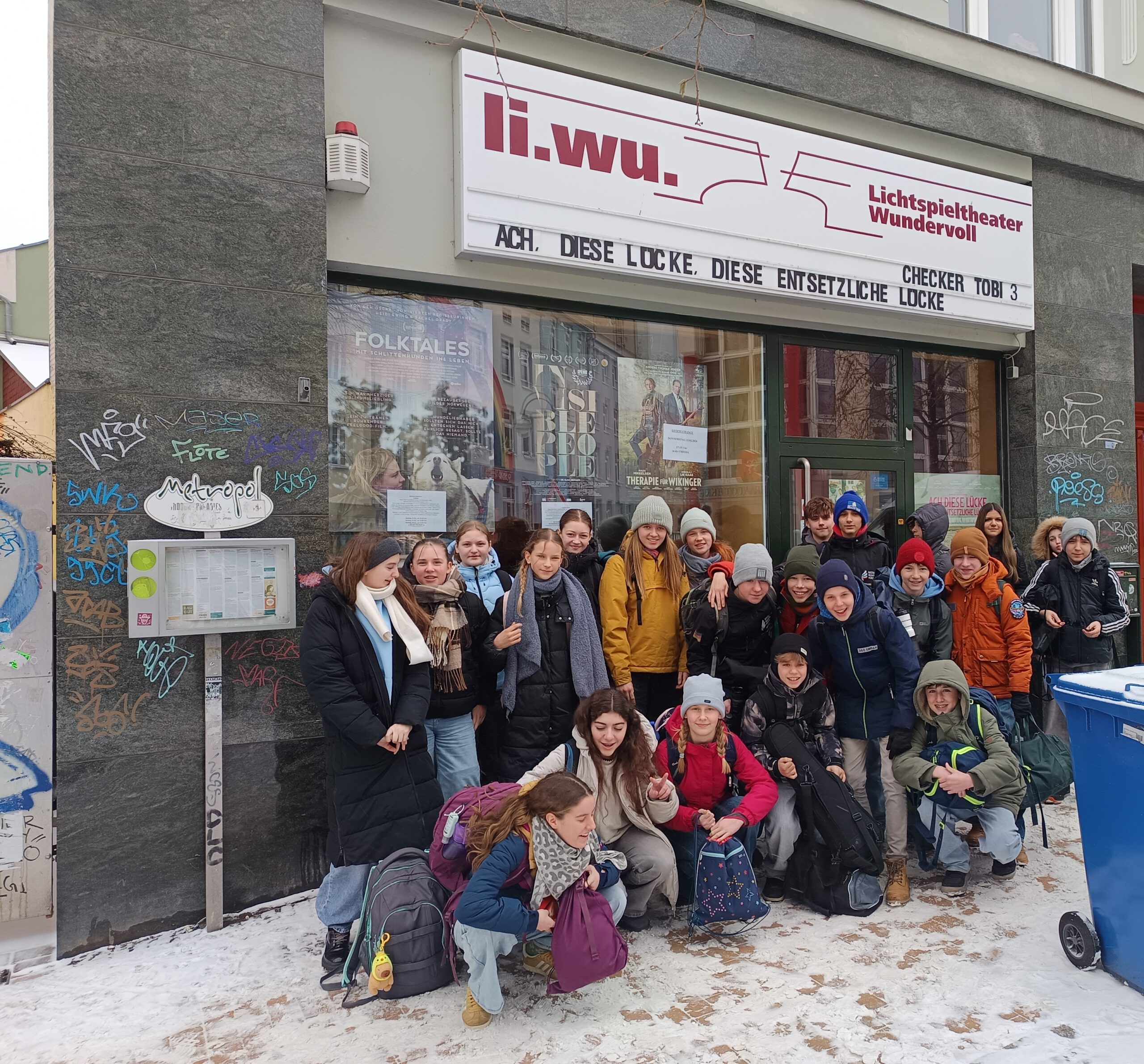 Als alljährliches Highlight kurz vor den Winterferien besuchten einige unserer Französischkurse der Jahrgänge 7, 8 und 9 die Cinéfête – die französischen Schulfilmwochen. Im gemütlichen Kinosaal des LiWu entflohen die Schülerinnen und Schüler der Klassen 7 und 8 den kalten Außentemperaturen, um sich bei der Komödie Un p’tit truc en plus zu amüsieren. Diese handelt von einem Gaunerduo, welche sich einer Gruppe von Menschen mit Behinderung anschließt und in so manch unterhaltsame Situationen gerät. Ein Kontrastprogramm war für die 9. Klassen das Drama Luise Violet, welches im Frankreich des späten 20. Jahrhunderts spielt und eine ambitionierte Lehrerin eines abgelegenen Dorfes porträtiert. Beide Filme wurden im französischen Original mit deutschen Untertiteln gezeigt und trafen das Interesse der Kinder und Jugendlichen. Vielen Dank an das LiWu für dieses tolle jährliche Angebot.