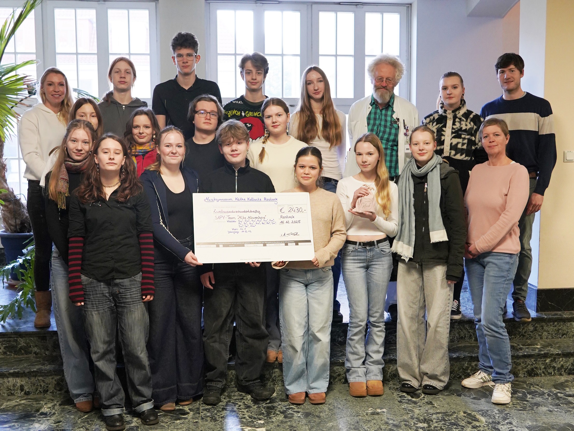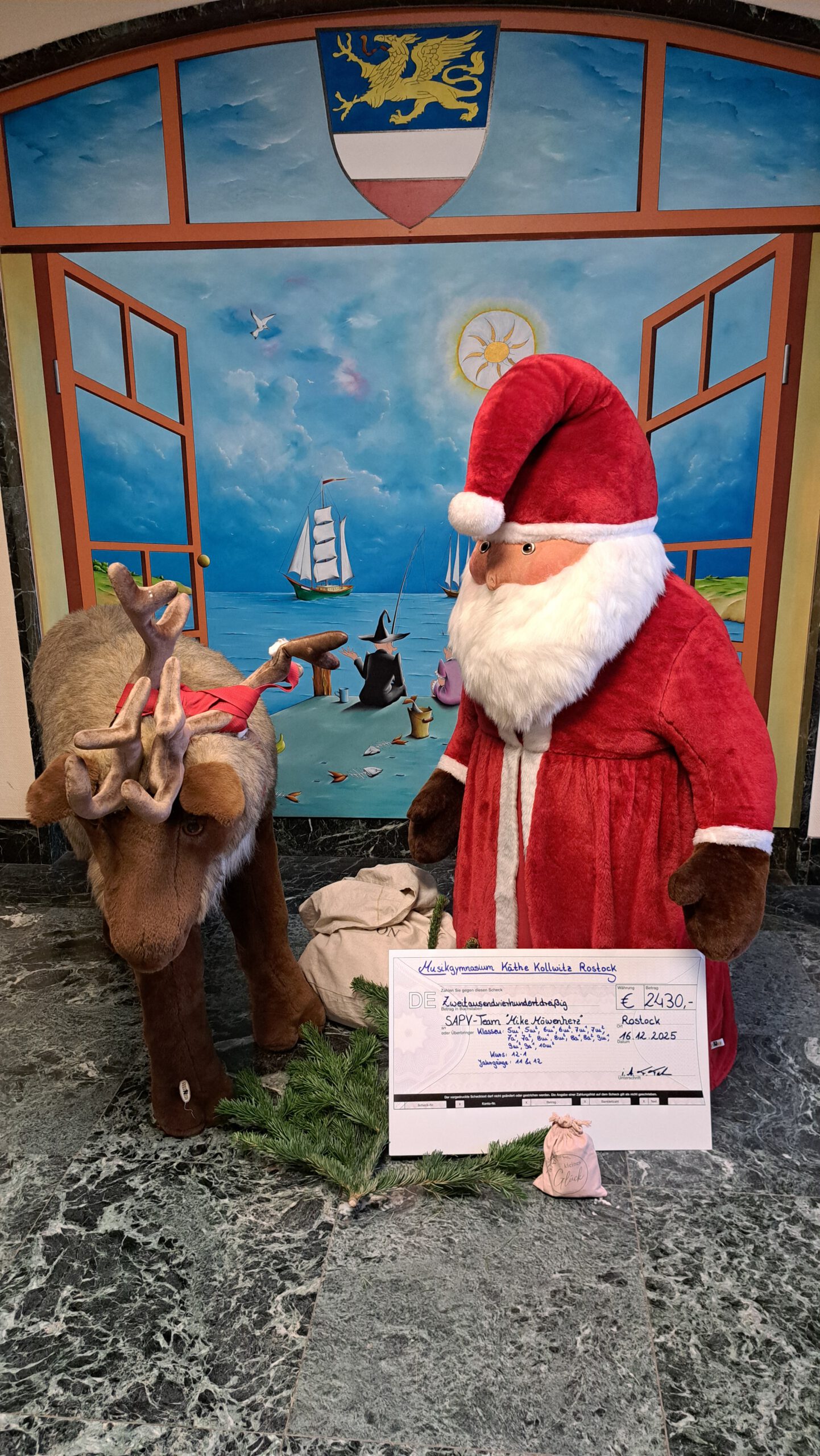 So war es uns möglich, in diesem Jahr eine faszinierende Spendensumme von 2430 Euro an die Kinderklinik zu übergeben. Mit unserer Spende können unheilbar kranken Kindern letzte Herzenswünsche erfüllt und die Pflege zu Hause bei ihren Familien ermöglicht werden. Die Klasse 9m1 hatte vor vier Jahren die Idee, die Einnahmen unseres Adventsbasars an das SAPV-Team „Mike Möwenherz“ zu spenden und so waren auch sie es, die den symbolichen Spendenscheck heute an Professor Dr. med C. F. Classen und sein Team übergaben.