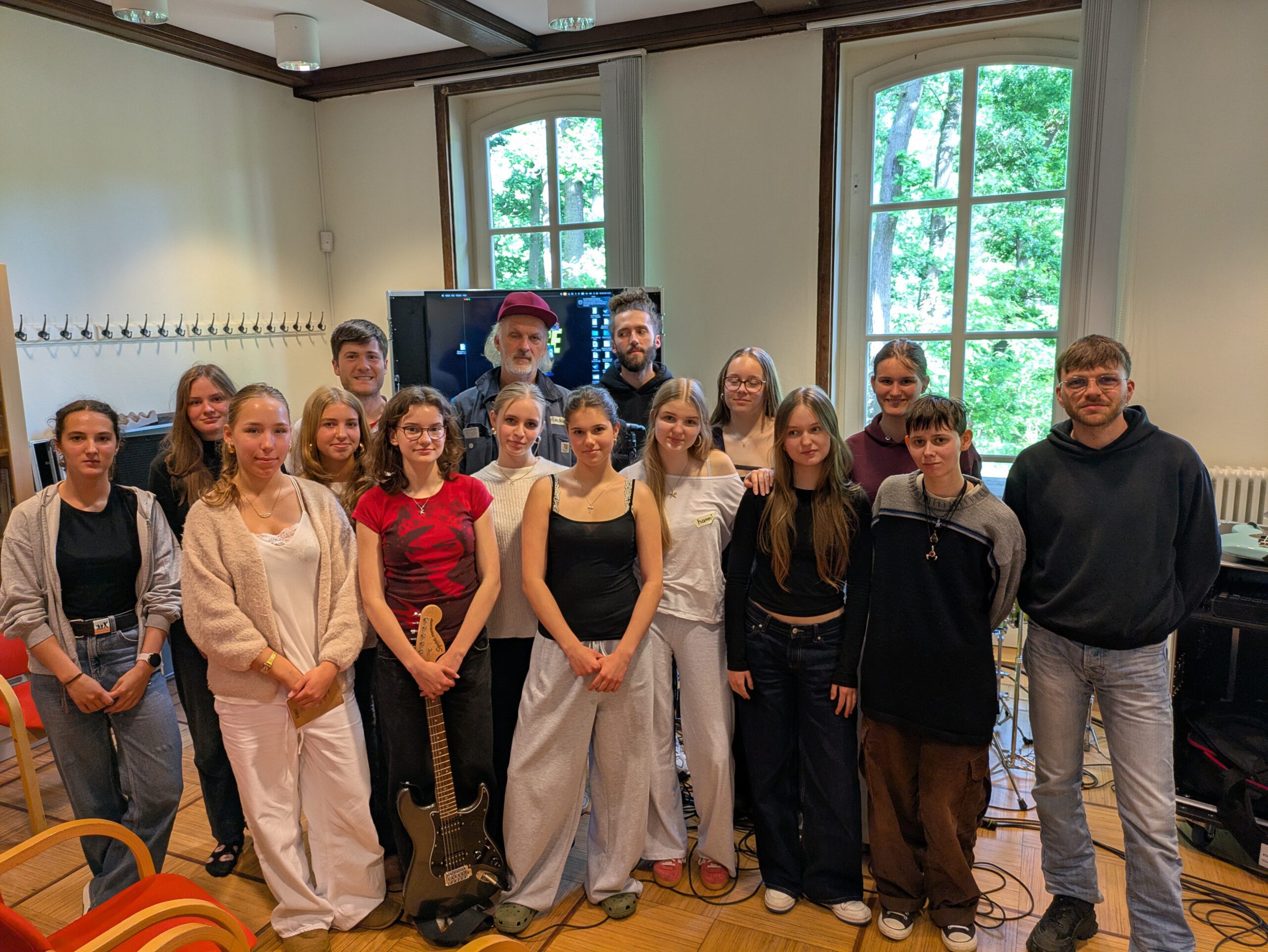 Der Mittwoch begann damit, dass wir eine selbstgeschriebene Akkordfolge und einen Text, in Reaktion auf das Erarbeitete des Vortrages, ausprobiert haben. Nachdem der beides im Kasten war, haben wir uns in zwei Gruppen aufgeteilt. Die eine Gruppe hat sich um den Text des Liedes gekümmert, dabei hat uns Nikko geholfen; währenddessen hat sich die andere Gruppe sich um den musikalischen Teil gekümmert. Es wurden verschiedene Stimmen eingesungen und Instrumente eingespielt, wobei Jakob die Aufnahmen gemischt hat. Schließlich haben wir beide Gruppen zusammengeführt und den Song gemeinsam produziert, wobei Jakob einen Großteil der Arbeit am Mischpult getan hat.